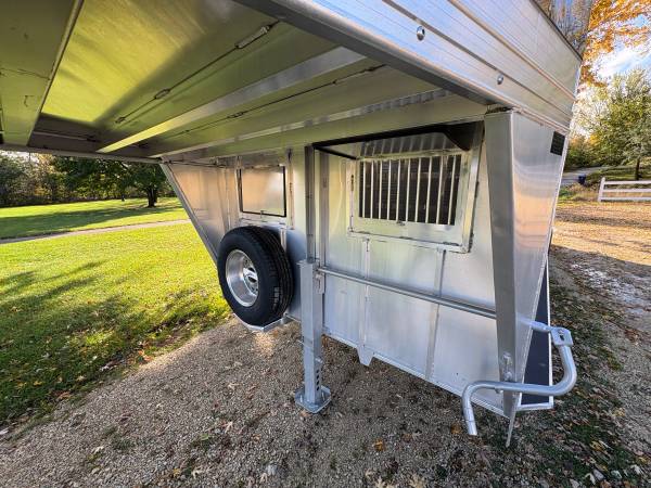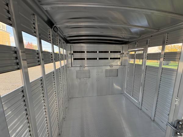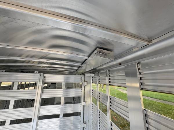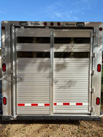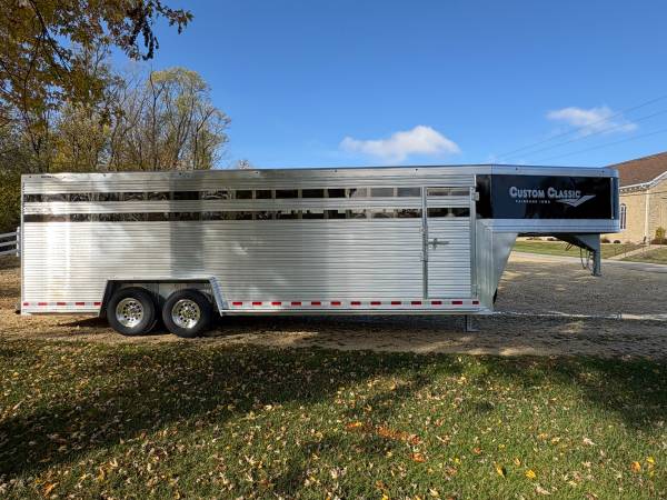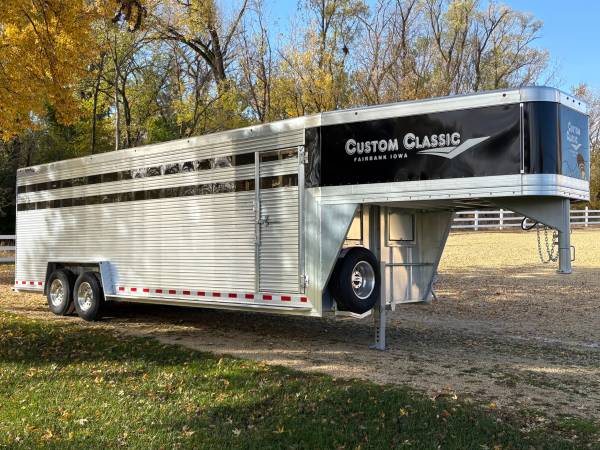 2026 Custom Classic Livestock Trailer. 7'6"Wide x 24'Long x 7'Tall. 2 - 7k Torsion Axles. 2 Center Gates. Sliding Walkthrough Doors on Both Center Gates. Front Drop sheet Vents. 5" Walk-Rail with Grip Tape. Lexan and Lexan Holder. Black Overlay on Nose. Extra 3/4" LED Lights. Aluminum Rims. Spare Wheel. 2 Rear Load Lights. Located In Fairbank, Iowa.